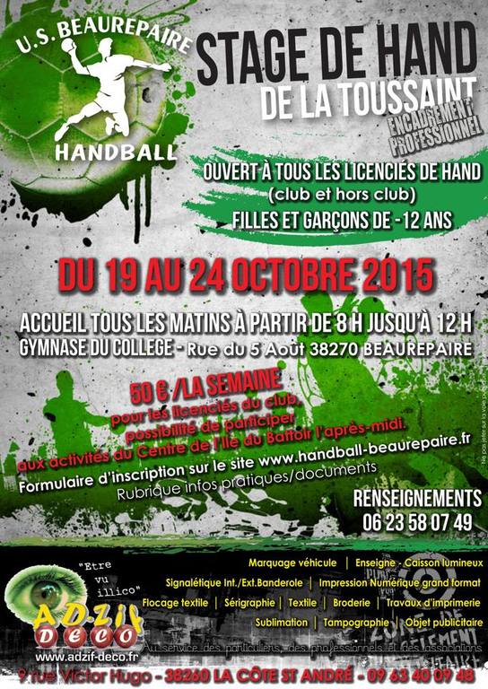Un stage de handball aura lieu pendant les vacances de la toussaint du lundi 19 octobre 2015 au vendredi 23 octobre 2015.