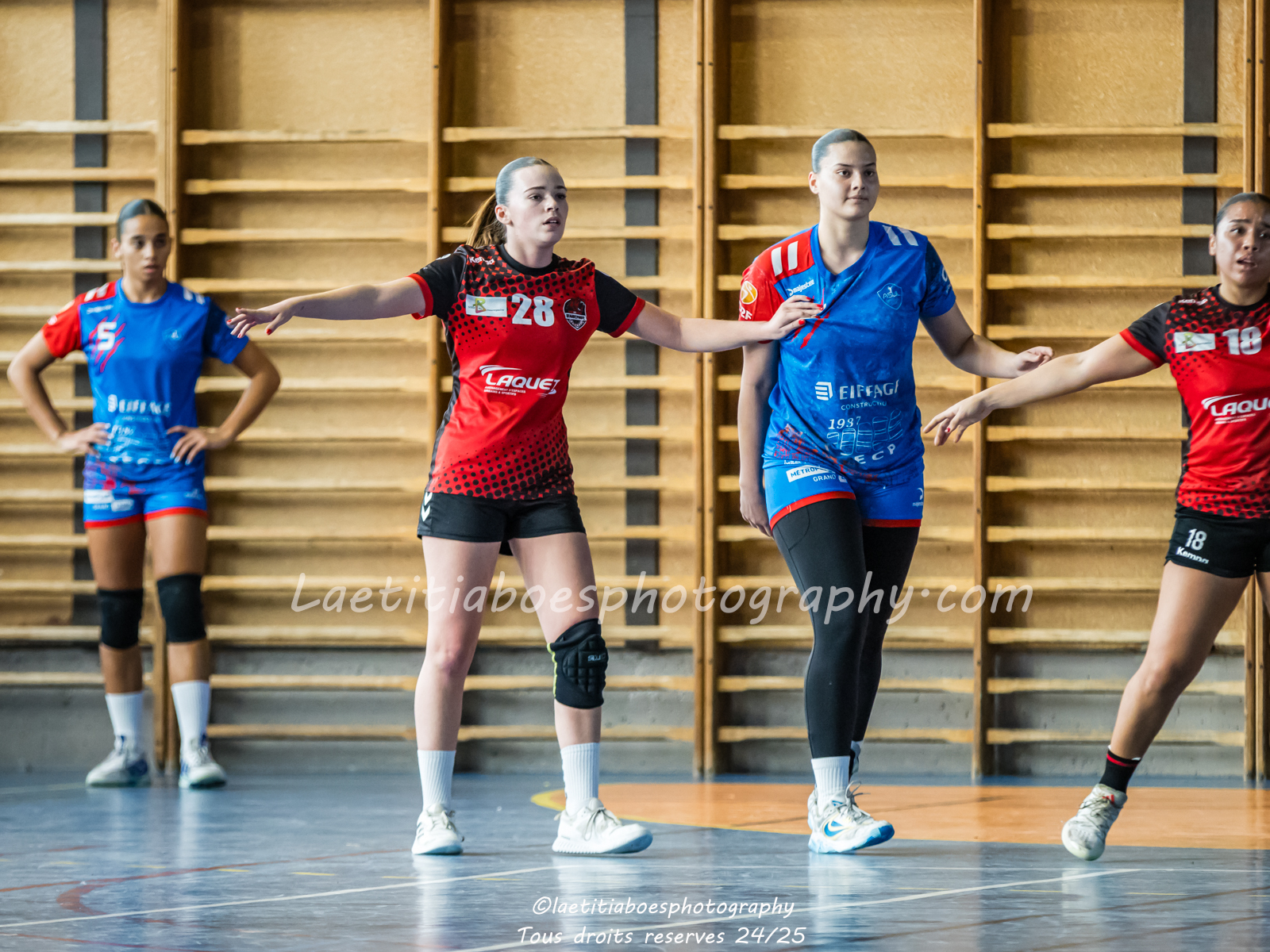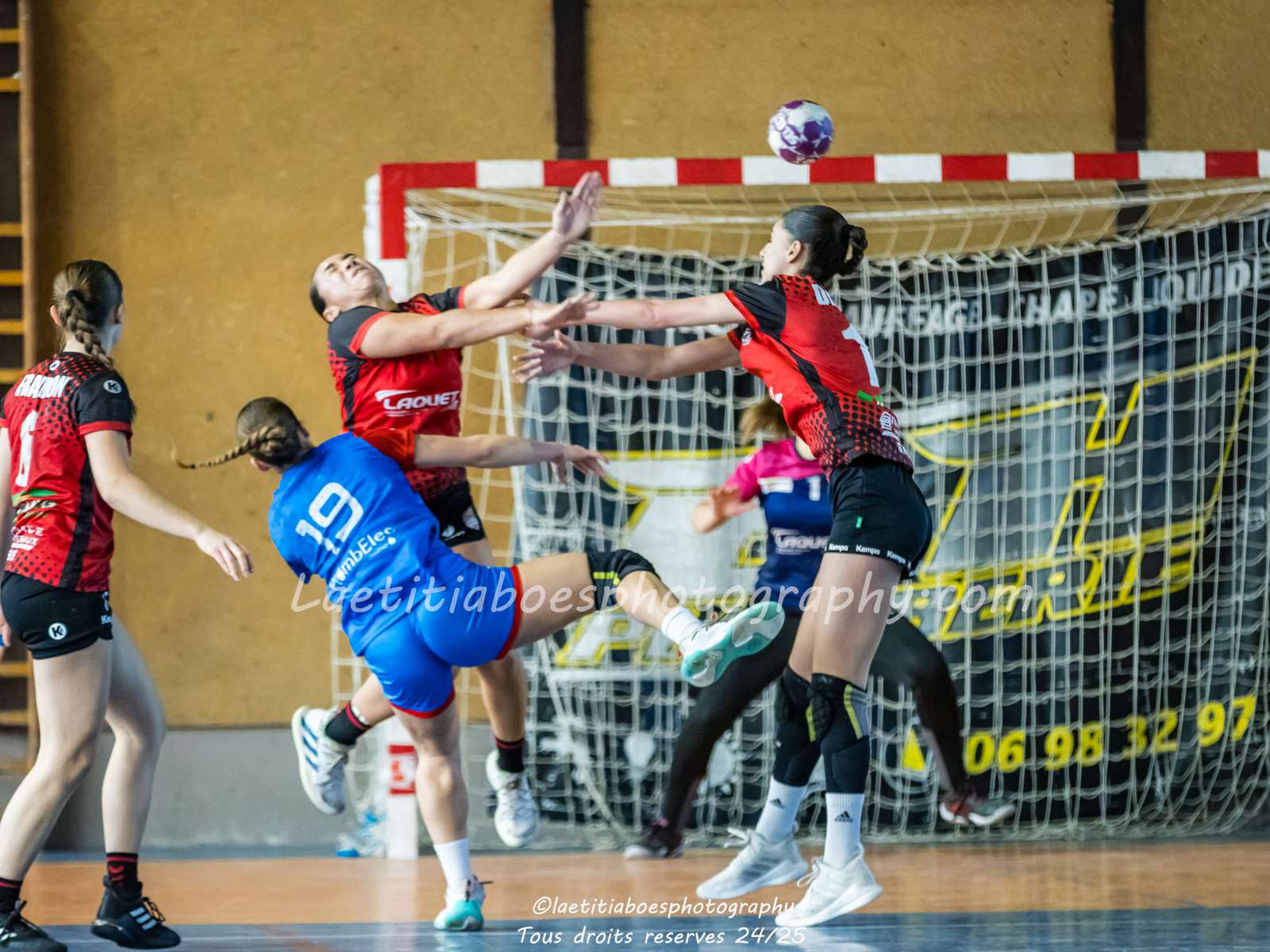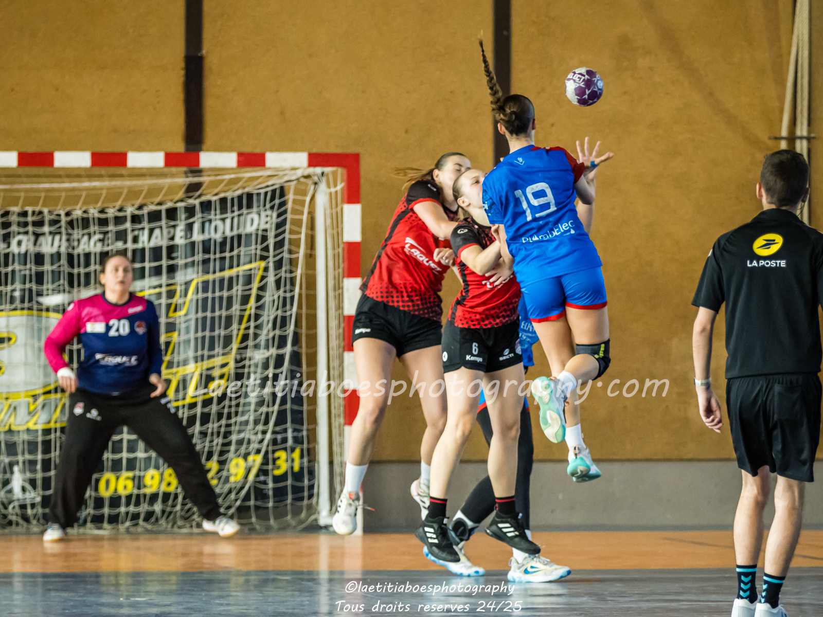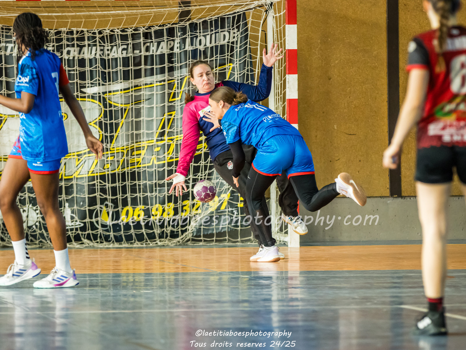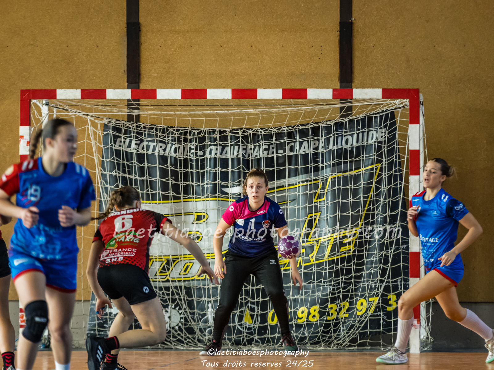 Noam, Orianne, Margot et Salomé protègent la cage d'Ambre contre Vaulx (Photo: L.Boes)